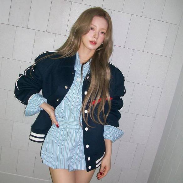 예지는 프레피 특유의 단정한 틀 위에 빈티지한 텍스처를 입혔습니다. 체크 셔츠와 맨투맨을 레이어드 하고 짧은 스커트에 스웨이드 텍스처의 오버사이즈 아우터를 걸치면서 룩의 인상이 한층 부드러워지죠. 여기에 밝은 헤어 컬러와 미니 백이 더해져 무드가 너무 무겁지 않도록 적절히 균형을 잡아줍니다. 프레피 룩을 너무 반듯하게만 가져가지 않고, 살짝 헐렁한 실루엣과 여유로운 분위기로 풀어낸 점이 특히 매력적이에요.