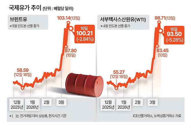 16일(현지시간) 5월 인도분 브렌트유 선물 종가는 배럴당 100.21달러로, 전 거래일보다 2.84% 떨어진 가격에 거래됐다. 앞서 직전 거래일인 지난 13일 브렌트유는 전장보다 2.7% 상승한 배럴당 103.14달러에 마감했다. 종가 기준으로 2022년 7월 말 이후 3년7개월여 만에 가장 높은 가격이었다.