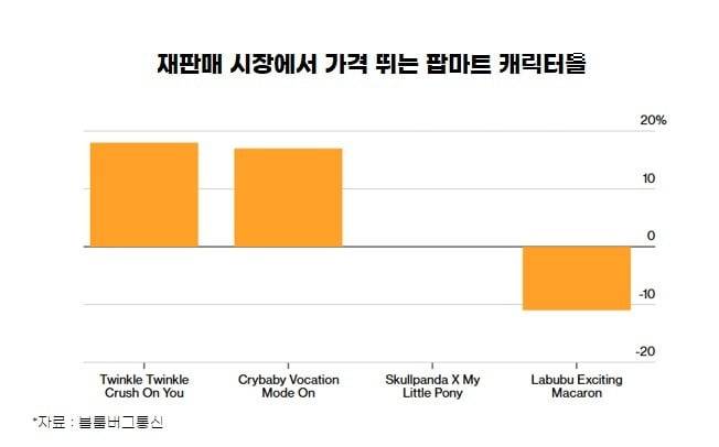 특히 트윙클 트윙클, 스컬판다, 크라이베이비 같은 캐릭터들이 각자의 팬덤을 형성하며 새롭게 부상하고 있다. 이들 제품은 중고 거래 플랫폼에서 이미 프리미엄 가격에 거래되고 있다. 팝마트의 매출 판매 비중에서도 빠르게 입지를 구축하고 있다.