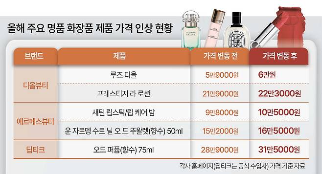 다른 명품 화장품 브랜드도 가격 인상을 단행했다. 크리스챤 디올 뷰티는 ‘루즈 디올’ 가격을 5만9000원에서 6만원으로, ‘프레스티지 라 로션’은 21만9000원에서 22만3000원으로 올렸다. 에르메스 뷰티는 ‘새틴 립스틱’과 ‘립 케어 밤’ 가격을 9만8000원에서 10만5000원으로 인상했다. 에르메스에선 10만원 이하 립스틱 제품이 사라졌다.