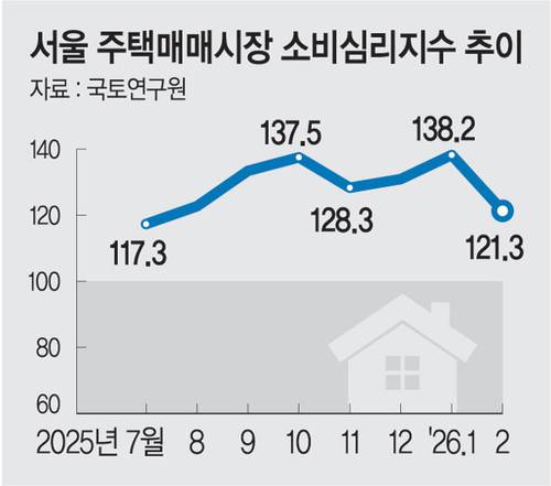 17일 국토연구원이 발표한 ‘2026년 2월 부동산시장 소비자 심리조사’에 따르면 2월 수도권 주택매매시장 소비심리지수는 114.4로 1월 127.5보다 13.1포인트 하락했다. 상승국면이던 수도권 매매심리가 한 달 만에 보합국면으로 내려온 것이다. 서울은 138.2에서 121.3으로 무려 16.9포인트 떨어지며 전국 주요지역 가운데 낙폭이 가장 컸다. 전국 기준으로는 122.1에서 112.3으로 9.8포인트 내렸다.