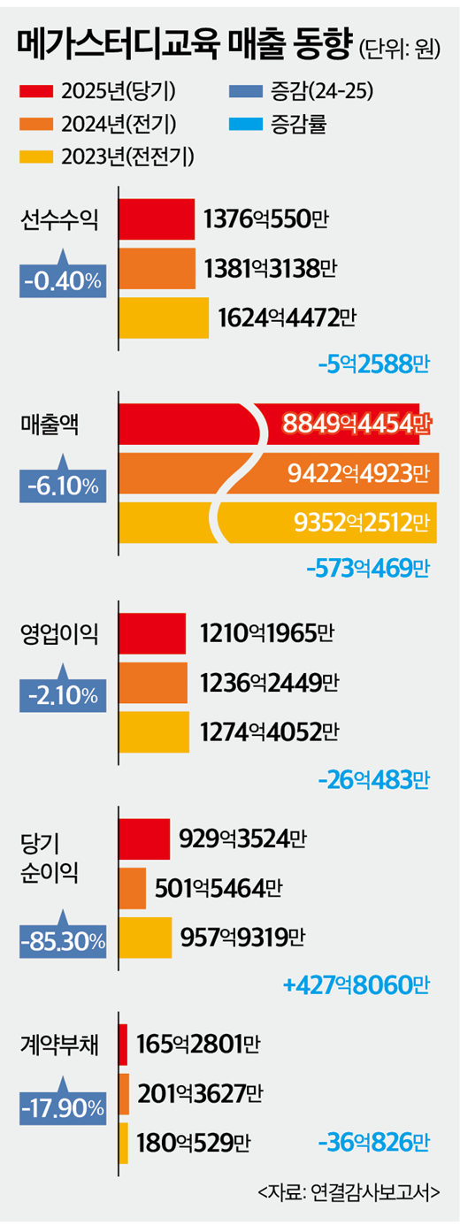 17일 업계에 따르면 메가스터디교육의 지난해 매출액은 약 8849억원으로 전년(9422억원) 대비 6.1% 하락했습니다. 외형 축소와 함께 미래 매출을 가늠하는 척도인 선수수익 역시 1376억원으로 줄어들며 3년 연속 내리막을 걸었습니다. 학원 기업의 선수수익은 수강생으로부터 현금을 미리 받고 교육 서비스(강의)를 제공해야 할 부채입니다. 서비스를 제공하는 기간에 선수수익이 줄면서 그만큼 매출이 잡히게 됩니다. 제조업의 수주잔고와 같습니다. 메가스터디교육의 선수수익은 2023년 1624억원에서 2024년 1381억원까지 급감했고, 작년에도 감소세가 이어졌습니다.