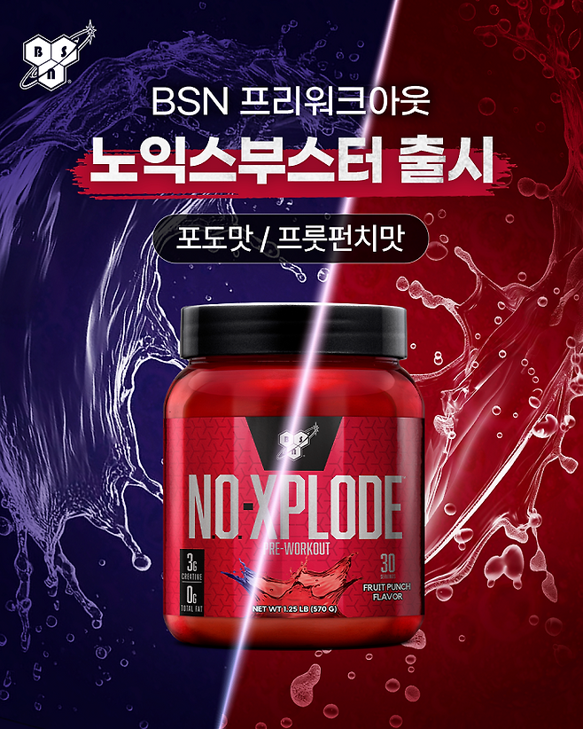 운동 전 컨디션을 끌어올려 줄 노익스 부스터가 정식으로 찾아온다. 글로벌 스포츠 뉴트리션 브랜드 BSN은 11일 자사 공식몰에 헬스부스터 ‘노익스플로드(N.O.-XPLODE)’ 포도맛과 프룻펀치맛 2종을 정식 출시했다.