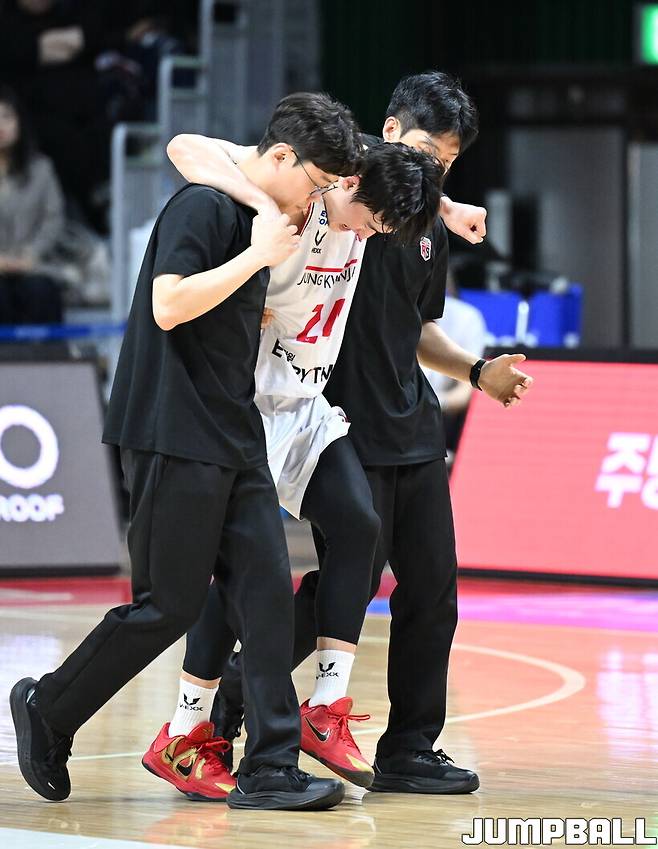 안양 정관장은 14일 부산사직체육관에서 열린 2025-2026 LG전자 프로농구 부산 KCC와의 정규시즌 6라운드 맞대결에서 91-86으로 승리했다. 그러나 우려스러운 장면도 있었다. 문유현이 2쿼터 도중 왼쪽 발목이 꺾이는 부상을 당한 것. 결국 다음 경기였던 16일 대구 한국가스공사전에 결장했다.