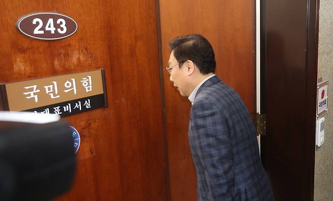 | ▲ 부산 지역 정연욱 국민의힘 의원이 17일 오전 서울 여의도국회 당 대표실을 찾아 장동혁 대표에게 부산시장 선거 경선 관련 입장을 전달하기 위해 들어서고 있다. |