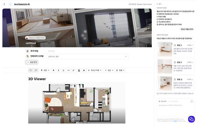 아키스케치는 AI 에이전트를 활용해 도면 등을 3차원 인테리어 공간으로 표현하는 솔루션을 공개했다.