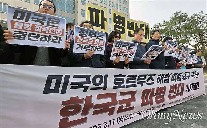 이들은 이날 발표한 기자회견문에서 "미국의 이란 공격은 국제법상 그 어떤 명분도 없는 불법 침략"이라고 규정한 뒤 "미국이 침략전쟁을 정당화하고 책임을 전가하기 위해 호르무즈의 '해상안전'을 내세워 한국군 파병을 요구하고 있다. 만일 한국 정부가 이러한 압박에 굴복해 파병한다면 침략전쟁에 국민을 총알받이로 내모는 것"이라고 주장했다.
