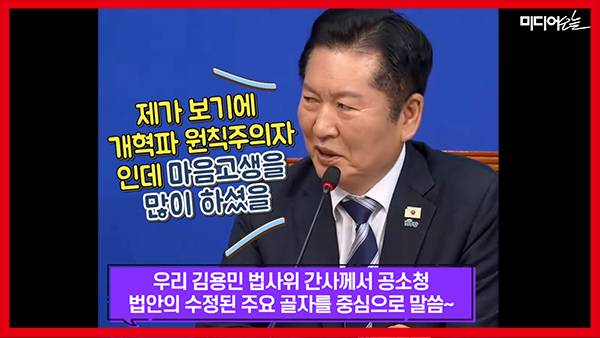 이어 정청래 대표는 김용민 간사 발언 차례를 두고는 “제가 보기에 개혁파 원칙주의자인데 마음고생을 많이 하셨을 우리 김용민 법사위 간사께서 어 공수처 법안에 수정된 주요 골자를 중심으로 말씀드리겠다”고 했다. 김용민 간사가 “오늘 발표하는 이 조정안이 당장 완벽한 마침표라고 말씀드릴 수는 없다”며 “하지만 적어도 행정부와 국회가 상호 역할을 존중하며 수사 기소 분리와 견제와 균형이라는 헌법적 원리를 구현하는 단단한 합의점을 찾아낸 것”이라고 마무리하자, 정청래 대표는 다시 위로의 말을 던졌다. “그동안 마음고생이 심했을 텐데 그래도 한결 괜찮죠?” 영상엔 정청래 대표가 추미애 위원장과 김용민 간사에게 던진 멘트가 담겼다.