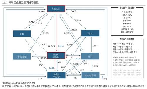 양국을 대표하는 완성차 기업 토요타와 현대차가 대표적 사례다. 글로벌 전통 완성차 기업인 양사는 모두 계열사 간 거미줄 같은 출자 구조로 소수 지분 오너 지배력을 강화해 비판받아왔다.