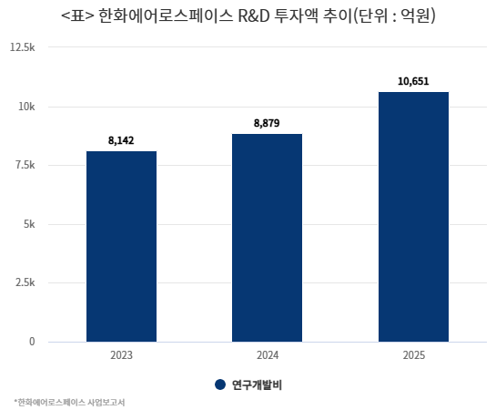 17일 한화에어로스페이스 사업보고서에 따르면 지난해 R&D에 1조651억원(연결기준)을 투입했다. 한화에어로스페이스 R&D 투자액이 1조원을 넘은 건 이번이 처음이다. 2024년(8879억원)과 비교했을 때 20% 증가했다.