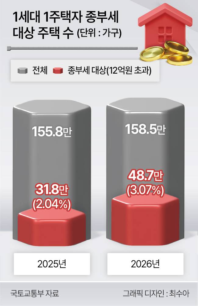 17일 국토부가 발표한 ‘2026년 공동주택 공시가격 열람’에 따르면 올해 전국 공동주택 1585만 가구 중 공시가격이 12억원을 초과해 1세대 1주택자 기준 종부세 대상이 된 주택 수는 약 48만7362가구로 집계됐다. 이는 전년(31만7998가구) 대비 16만9364가구 증가한 수치다.