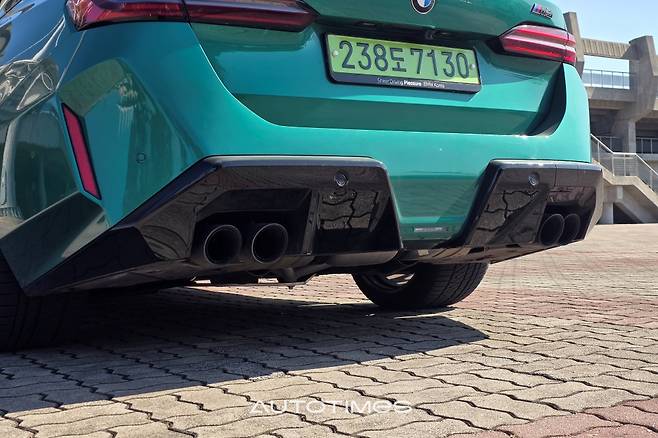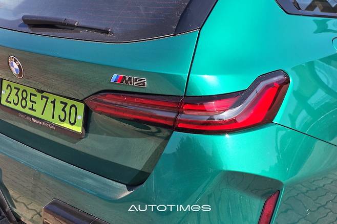 뒤는 5시리즈 세단과는 사뭇 다르다. 우선 수직으로 떨어지는 뒷유리창과 넓은 트렁크 면적이 대표적이지만 그보다도 눈꼬리를 치켜 올린 테일램프가 완전히 다른 차를 보는 듯하다. 여기에 M전용 리어 스포일러와 매우 두툼하게 표현한 범퍼, 주먹 여러 개는 동시에 들어가는 대구경 쿼드배기 파이프까지 화끈한 요소들로 가득하다. 참고로 신형 M5 투어링은 플러그인 하이브리드 방식이며 전기충전 포트는 운전석 쪽 앞 펜더, 연료 주입구는 조수석 쪽 뒤 펜더에 위치한다.
