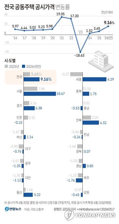 올해 전국 공동주택 공시가격은 작년 대비 평균 9.16% 상승했다.