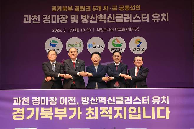 의정부시, 양주시, 포천시, 동두천시, 연천군이 17일 의정부시청 태조홀에서 열린 '경기북부 경원권 5개 시·군 공동선언식'에 참석해 과천경마공원(렛츠런파크 서울) 및 경기도 방산혁신클러스터 경기북부 유치를 강력히 촉구했다.