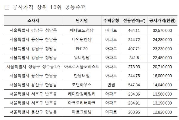 전국에서 가장 비싼 곳은 서울 강남구 청담동의 에테르노청담( 464.11㎡)으로 공시가격이 325억7000만 원이나 됐다.
