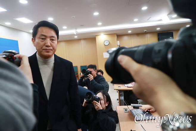 | ▲ 오세훈 서울시장이 17일 오후 서울시청 브리핑실에서 기자회견을 열고, 6.3지방선거 국민의힘 서울시장 후보 공천 신청을 하겠다는 입장을 밝힌 뒤 떠나고 있다. |
