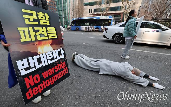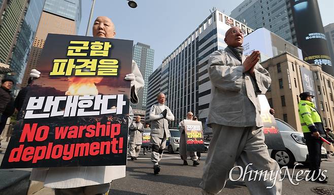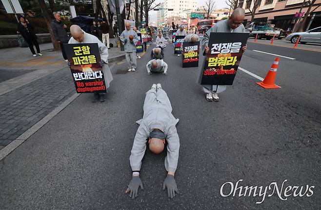 [오마이포토] "군함 파견 반대한다, 전쟁과 살생을 멈춰라" 평화를 위한 오체투지