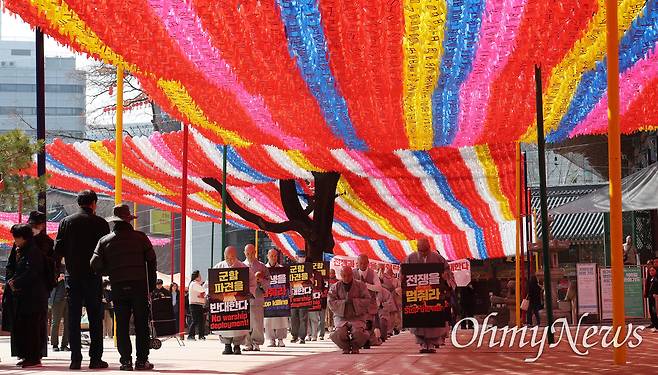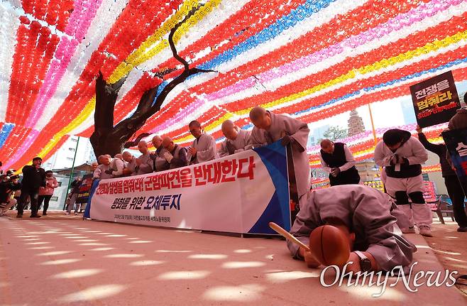 대한불교조계종 사회노동위원회 주최로 17일 오후 서울 종로구 조계사에서 미 대사관 앞까지 군함파견을 반대한다! 전쟁과 살생을 멈춰라! 평화를 위한 오체투지가 진행되고 있다.