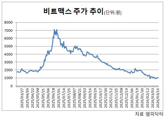 다만 감자는 기존 주주 지분가치 희석과 함께 재무 부담을 드러내는 신호로 해석되는 경우가 많다. 주가도 크게 흔들렸다. 비트맥스는 지난 10일 장중 801원까지 밀리며 52주 신저가를 기록했고, 이날 역시 상승분을 반납하며 1000원 아래인 994원에 거래를 마쳤다.