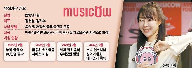정현경 뮤직카우 의장은 최근 매일경제와 인터뷰에서 "장외거래소 예비인가를 획득하며 음악수익증권을 금융시장의 대세 자산으로 만들 수 있는 계기가 마련됐다"며 "22조원의 잠재 규모를 갖고 있는 음악수익증권 시장이 활성화하며 정부가 추진하는 'K컬처 300조' 시대를 앞당길 수 있을 것"이라고 했다.