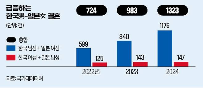 이 같은 상호 호감도 상승은 혼인 증가로 이어졌다. 국가데이터처의 ‘2024년 혼인·이혼 통계’에 따르면 2024년 한국 남성과 일본 여성의 혼인은 1176건이었다. 전년(840건) 대비 40.2% 급증한 것으로 10년 만에 가장 많은 수치다. 반면 한국 여성과 일본 남성의 결혼은 147건에 그쳐 10년 전과 비교해 5분의 1 수준으로 급감했다.