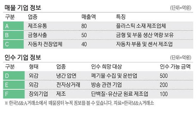 인수를 희망하는 기업 3곳도 등록됐다. D사는 냉간 압연·압출 제품 분야를 영위하고 있다. 폐기물 수집·운반·처리와 리사이클링 기업 인수를 원한다. 인수 가능 금액은 500억원 이내다. 전자상거래 소매업 분야 리딩그룹에 속한다고 밝힌 E사는 전국 방송 네트워크를 구축하고 있는 방송 관련 기업 인수를 희망한다고 밝혔다. 기존 사업 분야 광고 채널 확보가 목적으로 인수 가능 금액은 200억원 이내다.