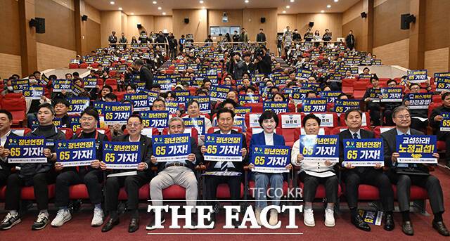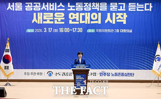 [더팩트ㅣ국회=남용희 기자] 김기철 한국노총 서울지역본부 의장과 정청래 더불어민주당 대표, 전현희 노동존중실천단 단장과 참석자들이 17일 오후 서울 여의도 국회 의원회관에서 열린 '서울 공공서비스 노동정책을 묻고 듣는다-새로운 연대의 시작' 수도권공공서비스노조(수공노조) 제3기 지도부 출범식에 참석해 손피켓을 들어보이고 있다.