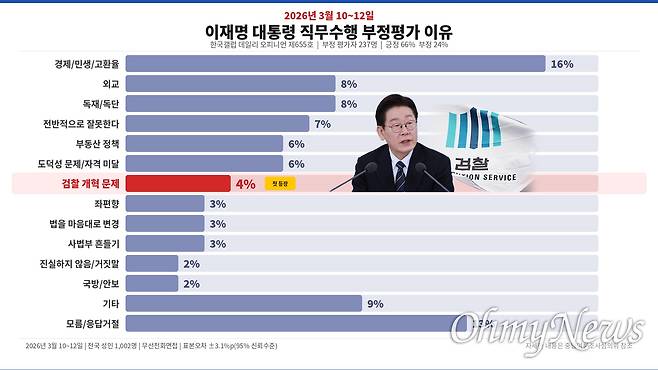 - 그런데 지난주 한국갤럽 조사에서 이재명 대통령은 직무수행 긍정 평가 최고치를 찍었는데 부정 평가 내용 중 주목할 부분이 있었다. 바로 대통령 부정 평가 이유에 '검찰 개혁 문제'가 처음 등장한 것. 그간 검찰·사법개혁(2025년 9월 3주차), 대장동 사건/검찰 항소 포기 압박(11월 2~4주차), 법을 마음대로 변경(3월 1주차) 등이 부정 평가 이유로 꼽힌 조사들은 있었다. 하지만 해당 사안들은 주로 사법부를 대상으로 하는 내란전담재판부 설치나 법 왜곡죄·재판소원·대법관 증원 같은 이슈들이었다. 대통령으로선 산적한 현안들이 많은데 자꾸 검찰개혁으로 '불'이 번지는 것을 막아야겠다는 필요성을 느꼈을 것. 이 대통령은 17일 국무회의에서도 검찰개혁 논의 과정을 두고 아쉬움을 토로했다.