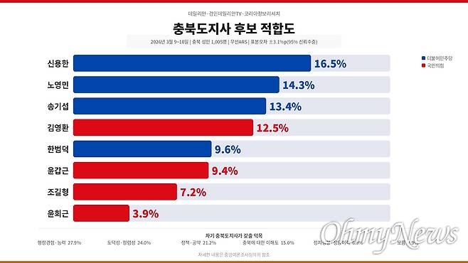 - 충북도지사 후보 적합도 : 김영환 12.5% 노영민 14.3% 송기섭 13.4% 신용한 16.5% 윤갑근 9.4% 윤희근 3.9% 조길형 7.2% 한범덕 9.6% - 민주당 후보 경쟁력 : 노영민 17.5% 송기섭 15.5% 신용한 24.3% 한범덕 13.1% 기타 7.2% 없음 16.4% 모름 6.1%