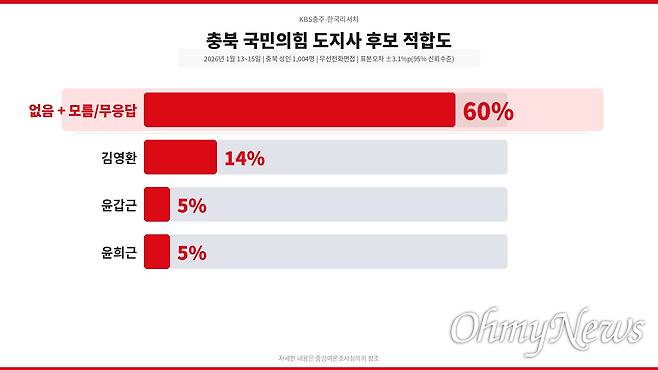 - 국민의힘 후보 적합도 : 김영환 14% 윤갑근 5% 윤희근 5% 없음+모름/무응답 60% - 대통령 국정 수행 평가 : 긍정 65%-부정 27%