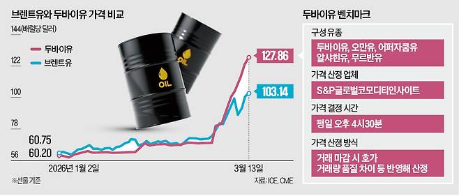 미국과 이란 간 전쟁으로 한국이 주로 수입하는 원유인 두바이유 가격 시스템이 망가졌다. 두바이유 벤치마크 가격을 구성하는 주요 유종인 두바이유와 오만유의 가격 상승 폭이 다른 원유보다 커지면서다. 두바이유가 가격 기능을 사실상 상실해 중동산 원유 비중이 70%에 달하는 한국 정유업계의 타격이 불가피할 전망이다.