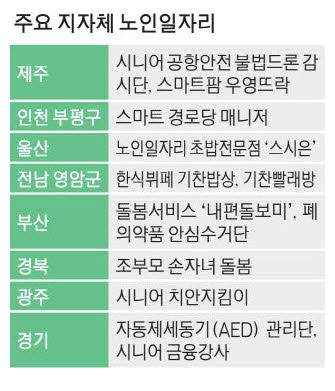 이외에도 부산시의 '폐의약품 안심수거단', 광주시의 '시니어 치안지킴이', 경기도의 '자동제세동기(AED) 관리단' 과 '시니어 금융 강사' 등 다양한 노인 일자리 사업이 전국적으로 운영되고 있다. 이를 통해 노인들은 인생 황혼기에도 소득도 올리며 지역사회 구성원으로 활발히 활동하고 있다.