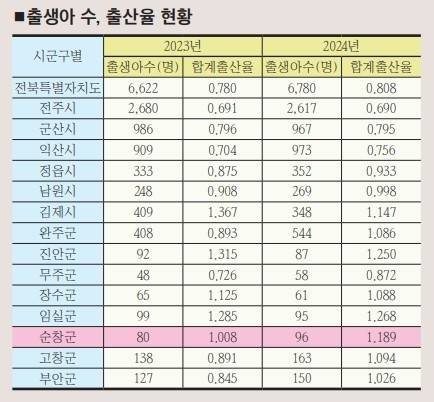 2024년 출산율 순위에서 각각 1, 2위를 차지한 임실군(1.268명)과 진안군(1.250명)에 이어 순창군(1.189명)은 전북 내에서 세 번째로 출산율이 높은 지자체가 됐다. 순창군의 출생아 수도 1년 전보다 증가했는데, 2023년에 80명이었던 출생아 수는 2024년 96명으로 증가하며 100명에 근접했다.