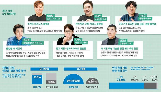 창업에서도 경력이 중요하다. 한 번 사업에 실패한 후 폐업·재기에 도움을 받은 창업자의 성공 확률은 크게 올라간다. 중소벤처기업부와 창업진흥원이 발표한 '2023년 재창업 기업 실태조사'에서 '재도전성공패키지' 등 재창업 지원 사업에 참여했던 기업은 5년 생존율이 83.5%를 기록했다. 일반 창업 기업의 5년 생존율(33.9%)과 비교하면 2배 이상 높다. 초반부터 '돈 되는 사업'을 고민하기 때문에 성과도 빠르게 난다. 하지만 국내에서는 재창업 비중이 29%에 그친다. 창업자들이 2회 이상 창업에 쉽사리 도전하지 못하는 상황이다.