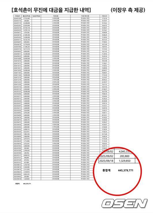 특히 이장우 측은 자신들의 무고함을 증명하기 위해 거래처인 법무법인 무진 측에 납품 대금을 지급한 내역을 모두 공개했다. 해당 내역서에는 2024년 1월부터 작년 9월까지의 이체 내역이 구체적인 금액과 함께 기재돼 있었다. 이에 따르면 '호석촌'은 매달 빠짐없이 대금을 보내왔으며, 총 합계는 4억 4530만원에 달하는것으로 확인됐다.