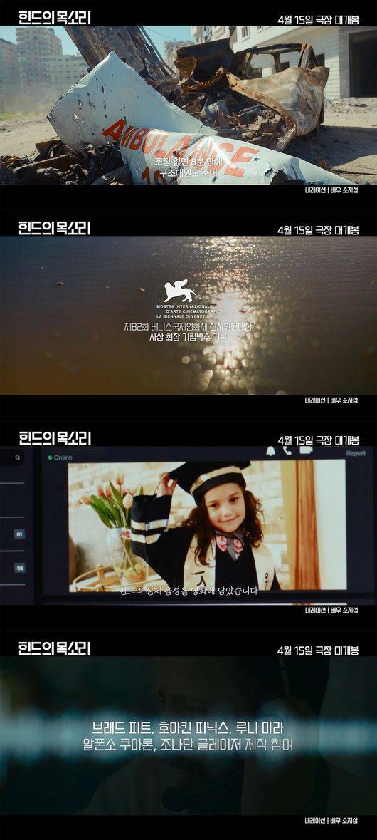 '힌드의 목소리'는 지난 2024년 1월 29일 가자지구, 폭격된 차에 홀로 갇힌 6살 소녀의 실제 목소리로 목도하는 이야기. 가족과 함께 피난 중이던 힌드가 국제구호단체 적신월사에 구조 요청을 하며 남긴 ‘실제 전화 음성’ 기록을 중심으로, 당시의 시간을 영화로 재구성했다. '피부를 판 남자'(2020), '올파의 딸들'(2023)을 연출한 카우타르 벤 하니야 감독이 연출을 맡았고, 브래드 피트, 호아킨 피닉스, 루니 마라, 알폰소 쿠아론 감독, 조나단 글레이저 감독이 총괄 제작으로 이름을 올렸다.