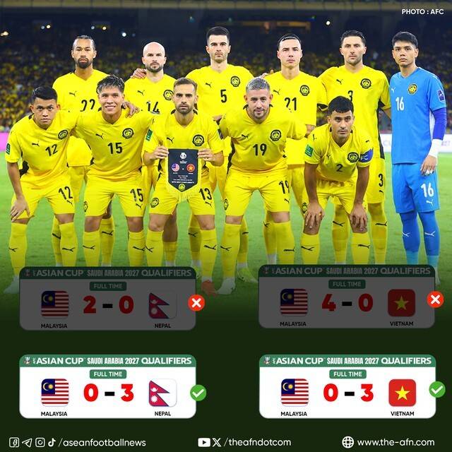 AFC는 17일 말레이시아가 2027 AFC 사우디아라비아 아시안컵 지역 예선 경기에서 출전 자격이 없는 선수들을 출전시켰다고 판단해 몰수패 처리를 내렸다고 밝혔다. 말레이시아는 지난해 치러진 아시안컵 지역 예선에서 베트남을 4-0으로 크게 이기는 등 성과를 냈지만, 조사 과정에서 부정 귀화 선수 7명이 발각되며 궁지에 몰렸다. FIFA는 이미 해당 선수들에게 출전 정지 징계를 내렸고 말레이시아축구협회(FAM)에도 44만 8,000달러(약 6억 7,000만 원)에 달하는 벌금을 부과했다.