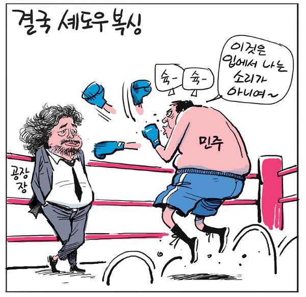 [경인만평] 결국 셰도우 복싱 이공명 2026. 3. 17. 19:15 음성으로 듣기 음성재생 설정 이동 통신망에서 음성 재생 시 데이터 요금이 발생할 수 있습니다. 글자 수 10,000자 초과 시 일부만 음성으로 제공합니다. 남성 여성 느림 보통 빠름 음성 재생하기 닫기 음성 재생 중지 번역 설정 번역beta Translated by kaka i 한국어 - English 영어 日本語 일본어 简体中文 중국어 Nederlands 네델란드어 Deutsch 독일어 Русский 러시아어 Malaysia 말레이시아어 বাঙ্গোল ভাষা 벵골어 tiếng Việt 베트남어 Español 스페인어 اللغة العربية 아랍어 Italiano 이탈리아어 bahasa Indonesia 인도네시아어 ภาษาไทย 태국어 Türkçe 튀르키에어 Português 포르투갈어 Français 프랑스어 हिन्दी 힌디어 닫기 번역중 Now in translation 글씨크기 조절하기 글자크기 설정 파란원을 좌우로 움직이시면 글자크기가 변경 됩니다. 가 매우 작은 폰트 작은 폰트 보통 폰트 큰 폰트 매우 큰 폰트 가 이 글자크기로 변경됩니다. (예시) 가장 빠른 뉴스가 있고 다양한 정보, 쌍방향 소통이 숨쉬는 다음뉴스를 만나보세요. 다음뉴스는 국내외 주요이슈와 실시간 속보, 문화생활 및 다양한 분야의 뉴스를 입체적으로 전달하고 있습니다. 닫기 인쇄하기 /이공명 Copyright © 경인일보 All rights reserved. 무단전재 및 재배포 금지.