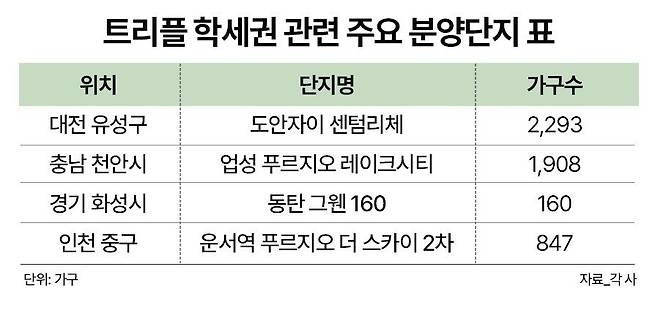 최근 분양 및 매매 시장에서 초등학교·중학교·고등학교를 모두 도보권에 둔 이른바 '트리플 학세권' 아파트에 대한 수요가 증가하고 있다.