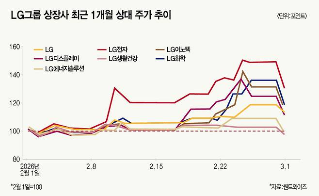 이 흐름에서 가장 주목받는 계열사는 단연 LG전자다. LG전자는 올 1~2월 주가가 59% 상승했다. LG전자는 이제 단순한 가전 업체가 아니라 로봇, 냉난방공조(HVAC), 전장(VS), 웹 운영체제(OS) 플랫폼 등을 갖춘 복합 성장주로 평가받는다. 가전 본업의 수익성과 전장 사업 이익 기여도 확대가 안정적으로 실적을 받쳐주고, 로봇과 피지컬 AI 사업에 대한 기대가 프리미엄을 더하는 구조다.