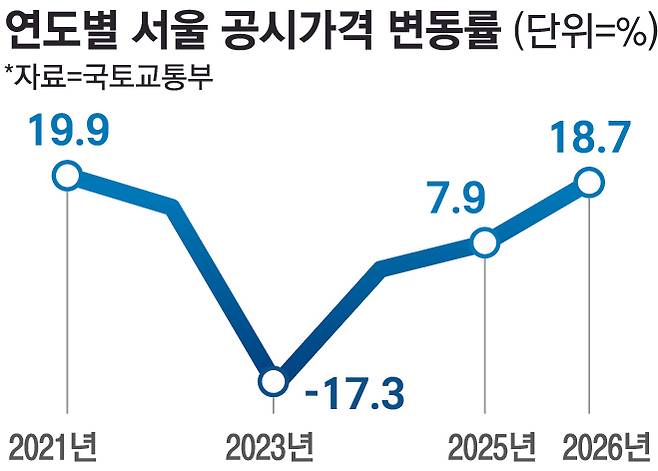 17일 국토교통부가 발표한 ‘2026년 공동주택 공시가격안’에 따르면 올해 전국 평균 공동주택 공시가격 상승률은 9.16%를 기록했다. 이는 전년 상승률인 3.65%를 크게 웃도는 것으로 2021년 이후 가장 높은 상승률이다. 특히 서울은 전국 평균의 2배 수준인 18.67%나 급등했다.