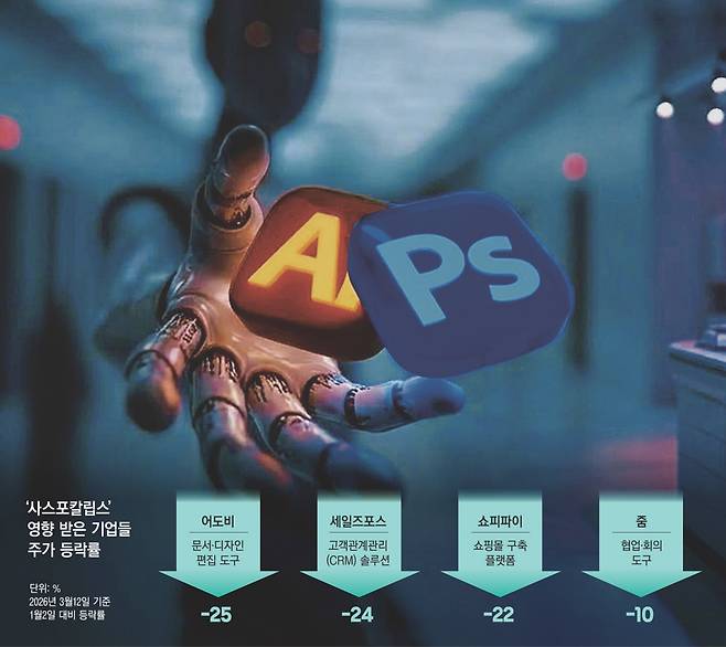 개발 지식이 필요 없는 자연어 기반의 바이브 코딩(인간 언어로 원하는 기능을 설명하면 AI가 코드를 짜주는 것)까지 유행하며 위기감을 키웠다. AI 확산으로 고용 자체가 줄면, 이용자(직원) 수를 기준으로 구독료를 받는 소프트웨어 서비스 산업의 비즈니스 모델이 흔들릴 수밖에 없다는 분석도 나왔다.