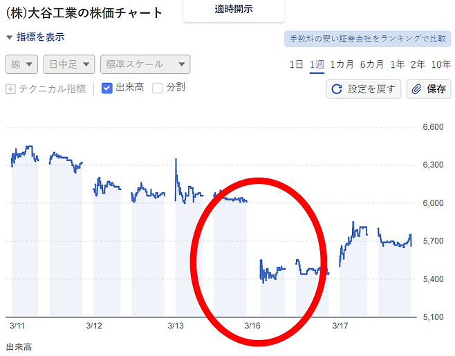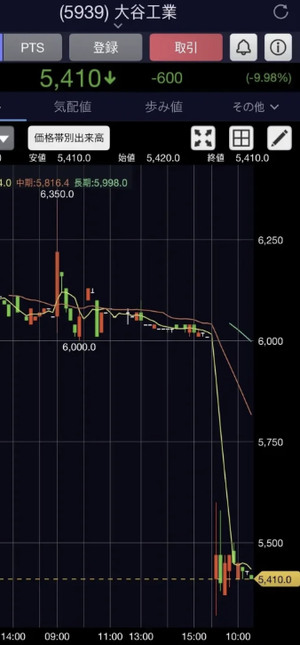 오타니공업의 지난 13일 종가는 6010엔이었으나 16일 시작가는 5410엔이었다. 9.98% 하락한 상황에서 거래가 출발한 셈이다. 결국 16일엔 크게 반등하지 못하고 5450엔에 거래가 마감됐다.