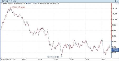 연합인포맥스(화면번호 6411)에 따르면 17일 오전 8시 33분 현재(이하 미 동부시간) 뉴욕 외환시장에서 주요 6개 통화에 대한 달러 가치를 반영하는 달러인덱스(DXY)는 99.717로 전장 마감 가격(99.792)보다 0.075포인트(0.075%) 하락했다.