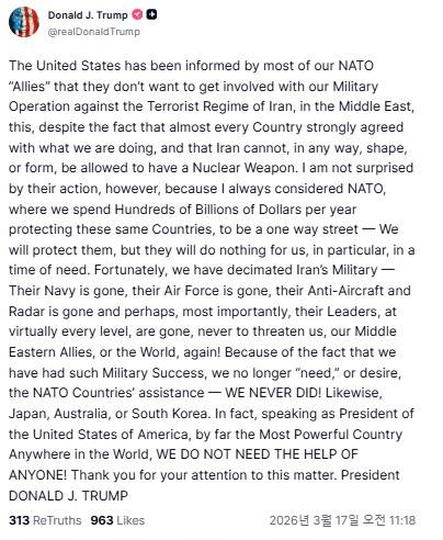 트럼프 대통령은 17일(현지시간) 자신의 소셜 미디어인 트루스 소셜에서 "미국은 우리의 나토 동맹국들 대부분으로부터, 중동에서의 이란 테러 정권에 대한 우리의 군사 작전에 관여하고 싶지 않다는 통보를 받았다"고 했다.
