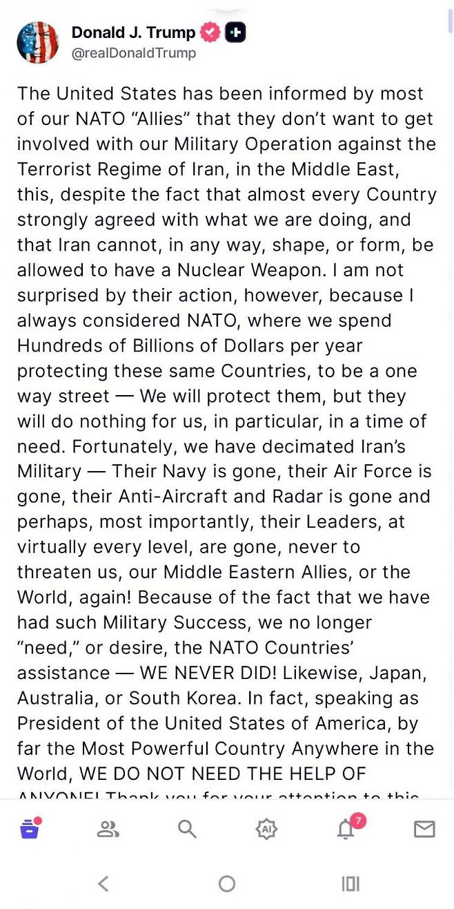 트럼프 대통령은 이날 사회관계망서비스(SNS) 트루스소셜에 "미국이 북대서양조약기구(NATO·나토) 동맹국들로부터 중동의 테러 정권 이란에 대항하는 우리의 군사 작전에 관여하고 싶지 않다는 통보를 받았다"고 글을 올렸다.