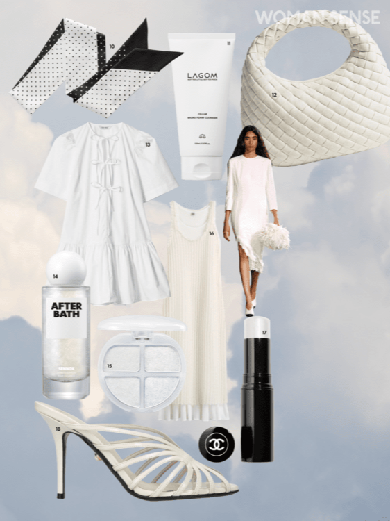 ⑩앤아더스토리즈 멀베리 실크 소재의 마이크로 도트 슬림 스카프 6만7천원 ⑪라곰 마이크로 폼 클렌저 자극받은 피부를 조밀한 거품으로 부드럽고 말끔하게 딥 클렌징해주는 고보습 저자극 클렌저 150ml 1만8천원 ⑫보테가 베네타 심리스 인트레치아토 수공예 기법으로 완성한 톱 핸들 백 4백50만원 ⑬앤아더스토리즈 가볍고 산뜻한 코튼 포플린 소재로 탄생한 미니드레스 11만원 ⑭센녹 샤이니 에브리데이 헤어 에센스 #애프터 배스 반짝이는 펄이 함유돼 부드러운 윤기와 향기를 선사하는 헤어 에센스 50ml 2만6천원 ⑮컬러그램 틴토리 아이 팔레트 #01글리토리 빛과 방향에 따라 달리지는 펄감을 지닌 4가지 화이트 톤의 아이섀도 4g 1만4천원 ⑯토템 퍼지 모헤어로 짜여진 오프화이트 컬러의 니트 드레스 1백69만원 ⑰샤넬 바움 에쌍씨엘 글로우 스틱 #펄리센트 페이스에 맑고 촉촉한 광채를 더하는 하이라이팅 밤 8g 6만4천원 ⑱알레비 페이턴트 소재의 화이트 힐 샌들 가격미정