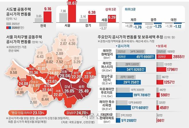 전국 공동주택의 평균 공시가격은 9.16% 올랐다. 지난해 3.65%, 2024년 1.52%를 크게 웃돌았다. 2022년 17.20% 이후 가장 높은 수치다.