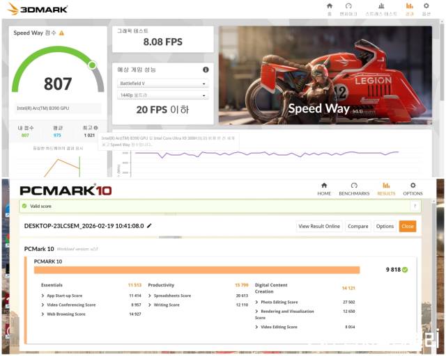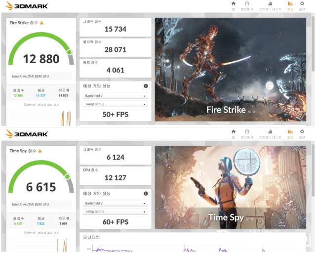 Xe3(Battlemage) 아키텍처 기반의 Arc B390 GPU 성능도 인상적이다. 3DMark 테스트 결과 파이어 스트라이크(Fire Strike) 그래픽 점수 15,734점, 타임 스파이(Time Spy) 6,124점을 나타냈다. 과거 메인스트림급 외장 GPU에 육박하는 수치다. 실제로 배틀필드 V(Battlefield V)와 같은 고사양 게임을 1440p 울트라 옵션에서 50~60 FPS 수준으로 구동할 수 있는 수준이다.