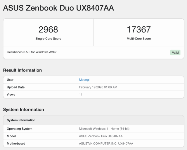 이번에 선택된 젠북 듀오는 '인텔 코어 울트라 X9 388H(팬서레이크)'가 적용됐다. 구분하자면 최상위 모델이다. 우선 프로세서의 기초 체력을 측정하는 긱벤치 6(Geekbench 6.5.0) 결과로 싱글코어 2,968점, 멀티코어 17,367점을 기록했다. 실무에서 가장 빈번하게 일어나는 앱 실행, 웹 브라우징, 단일 작업 속도가 비약적으로 향상됐다. 16코어 구성을 바탕으로 한 1만7천점대의 멀티코어 점수는, 두 개의 3K 화면에 수십 개의 창을 띄워놓고 AI 연산을 배경에서 구동하더라도 시스템이 원활하게 구동될 수 있도록 돕는다.